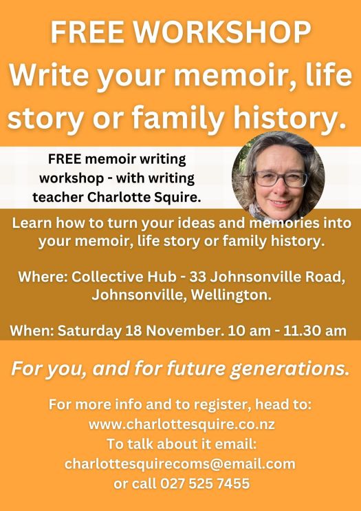 PPS For those of you who live in Wellington, I’m now offering a free memoir writing workshop there Saturday morning, 18 November. Details below. Click here to book in.